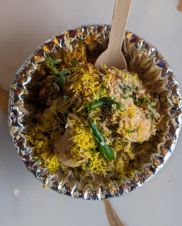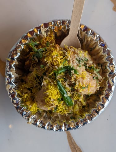 Odisha’s Dahibara Aludum: Yogurt - soaked vadas, spicy potatoes, peas, chaat. We serve that without Onions.