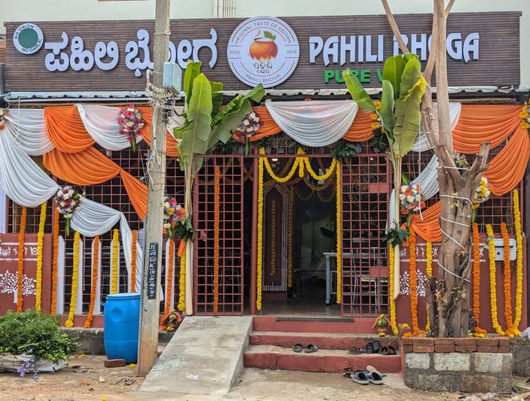 Nestled in a bustling city, Pahili Bhoga offers a vibrant dining atmosphere that celebrates Odia culture through delicious vegetarian delicacies crafted with care.